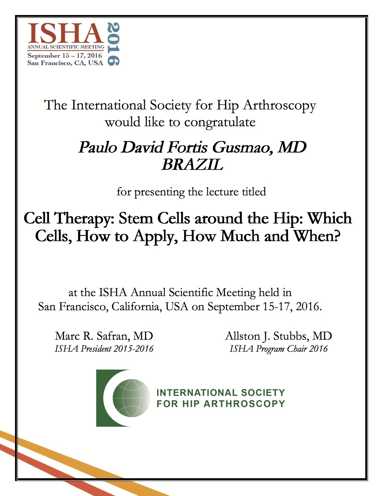 Durante os dias 15 a 17 de setembro ocorreu o Congresso Internacional de Artroscopia de Quadril de 2016 (ISHA - International Society of Hip Arthroscopy Meeting) em San Francisco nos Estados Unidos da América. Esse é o maior evento dedicado a preservação do quadril com técnicas menos invasivas como a vídeo artroscopia.