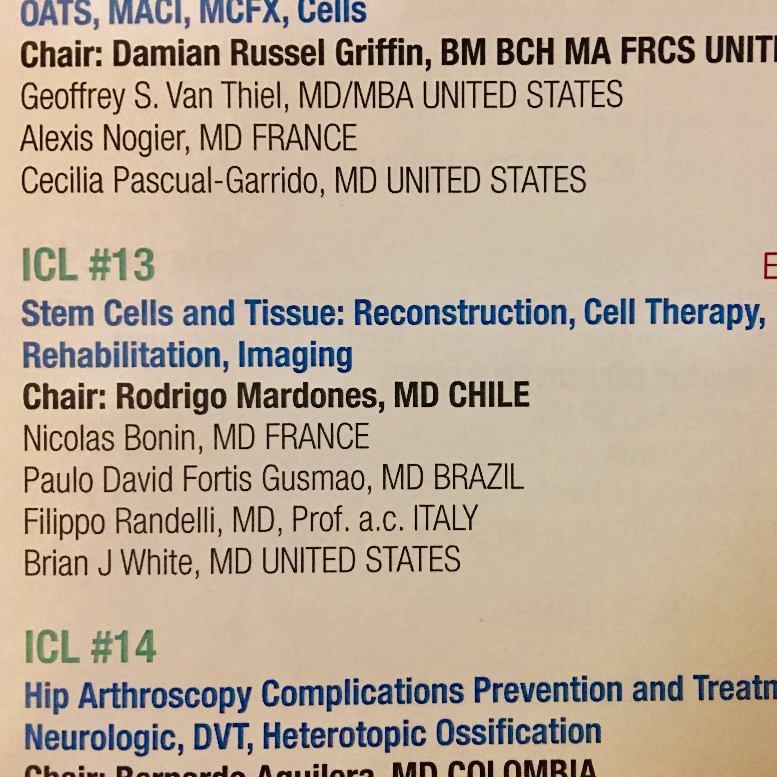 Tive a honra de ser convidado a palestrar sobre Terapias Celulares aplicadas ao Quadril. Neste módulo "Stem Cells and Tissues: Reconstruction, Cell Therapy, Rehabilitation, Imaging" participaram: Dr. Nicolas Bonin (França), Dr. Filippo Randelli (Italia), Dr. Brian White (EUA) e foi coordenada pelo Dr. Rodrigo Mardones (Chile).
