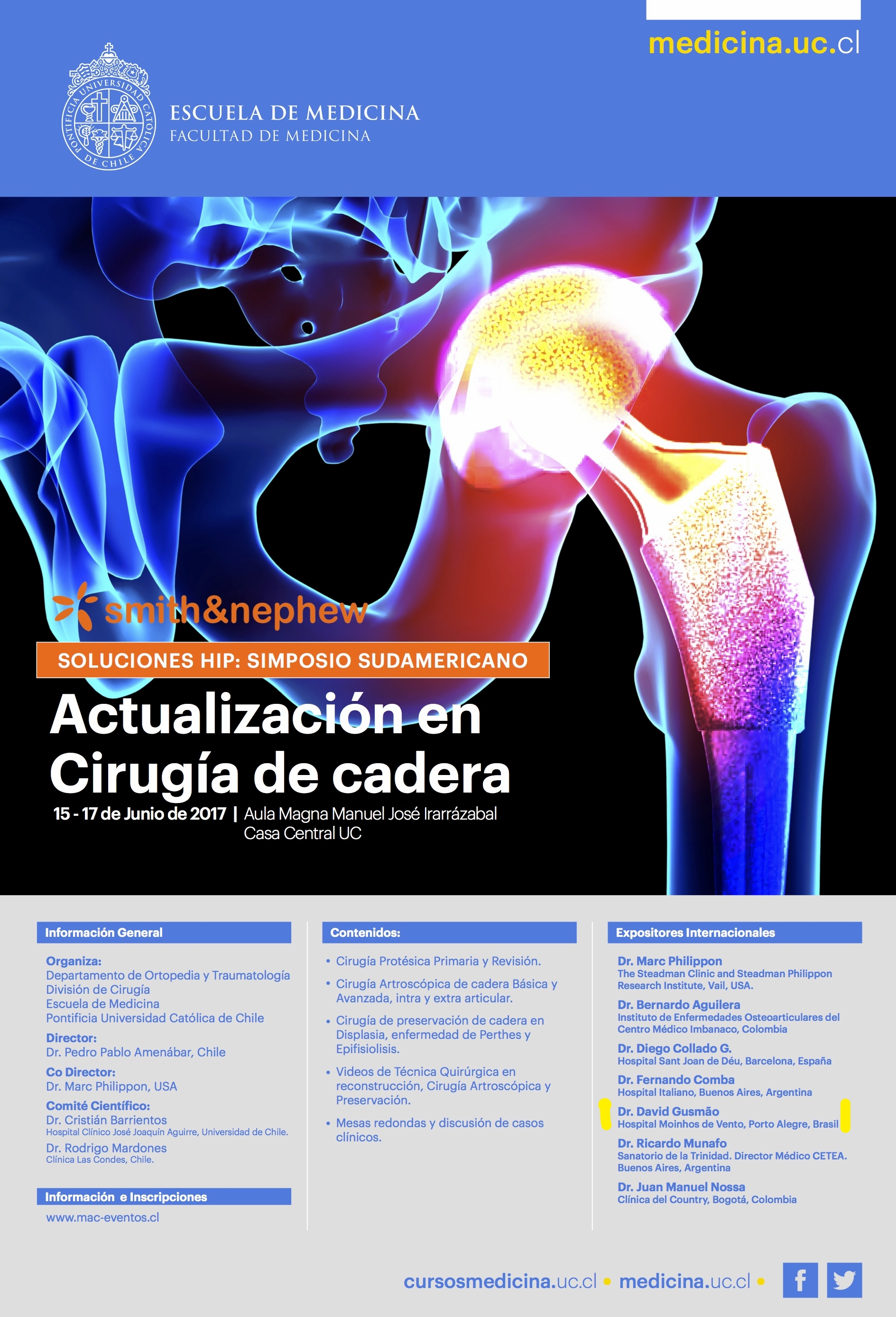 Saiba mais sobre o Simposio Sulamericano: "Actualización en Cirurgía de Cadera: http://cursosmedicina.uc.cl/es/todos-los-cursos/56-cursos-2017/146-simposio-sudamericano-de-actualizacion-en-cirugia-de-cadera