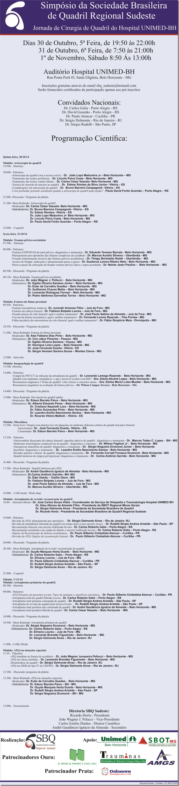 Nos dias 30 e 31 de outubro e 1º de novembro de 2014 foi realizado o Simpósio da Sociedade Brasileira de Quadril Regional Sudeste/Jornada de Cirurgia de Quadril do Hospital UNIMED BH,em Belo Horizonte, Minas Gerais.