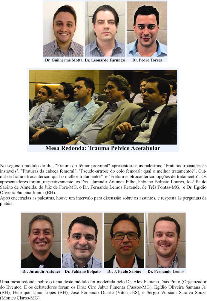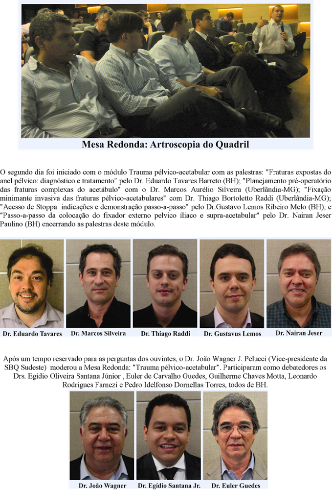 Após um tempo reservado para as perguntas dos ouvintes, o Dr. João Wagner J. Pelucci (Vice-presidente da SBQ Sudeste) moderou a Mesa Redonda: "Trauma pélvico-acetabular". Participaram como debatedores os Drs. Egídio Oliveira Santana Júnior , Euler de Carvalho Guedes, Guilherme Chaves Motta, Leonardo Rodrigues Farnezi e Pedro Idelfonso Dornellas Torres, todos de BH.