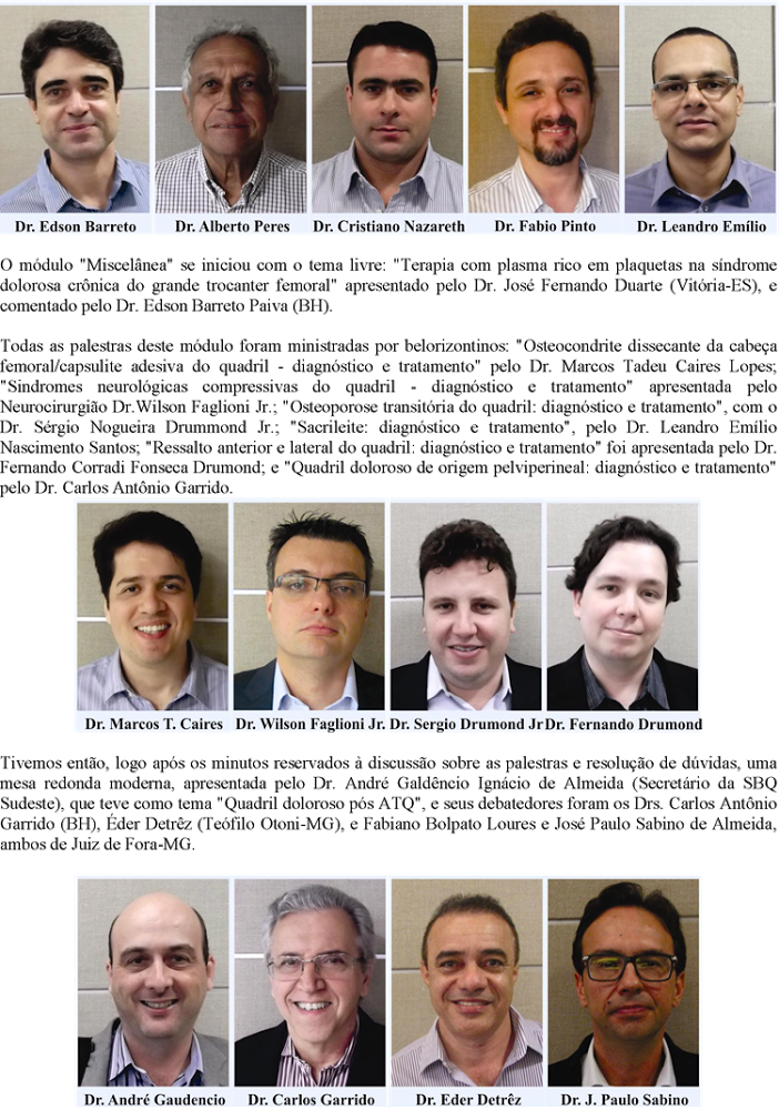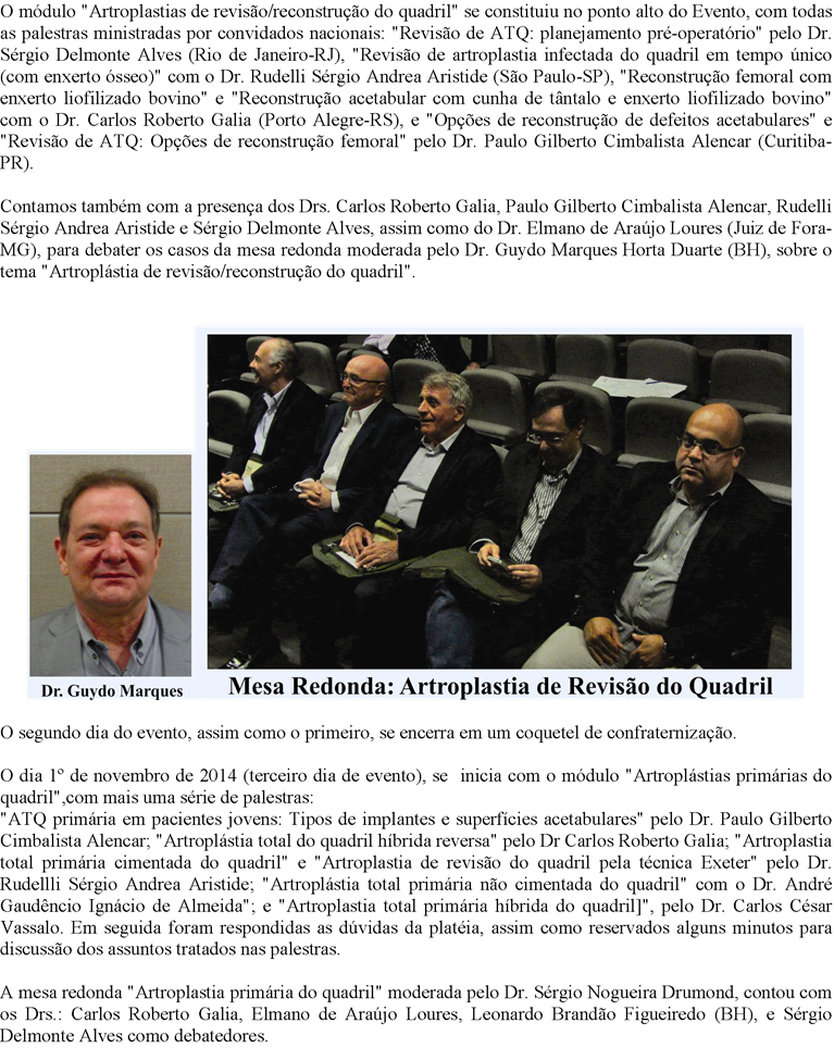 Contamos também com a presença dos Drs. Carlos Roberto Galia, Paulo Gilberto Cimbalista Alencar, Rudelli Sérgio Andrea Aristide e Sérgio Delmonte Alves, assim como do Dr. Elmano de Araújo Loures (Juiz de Fora-MG), para debater os casos da mesa redonda moderada pelo Dr. Guydo Marques Horta Duarte (BH), sobre o tema "Artroplástia de revisão/reconstrução do quadril".